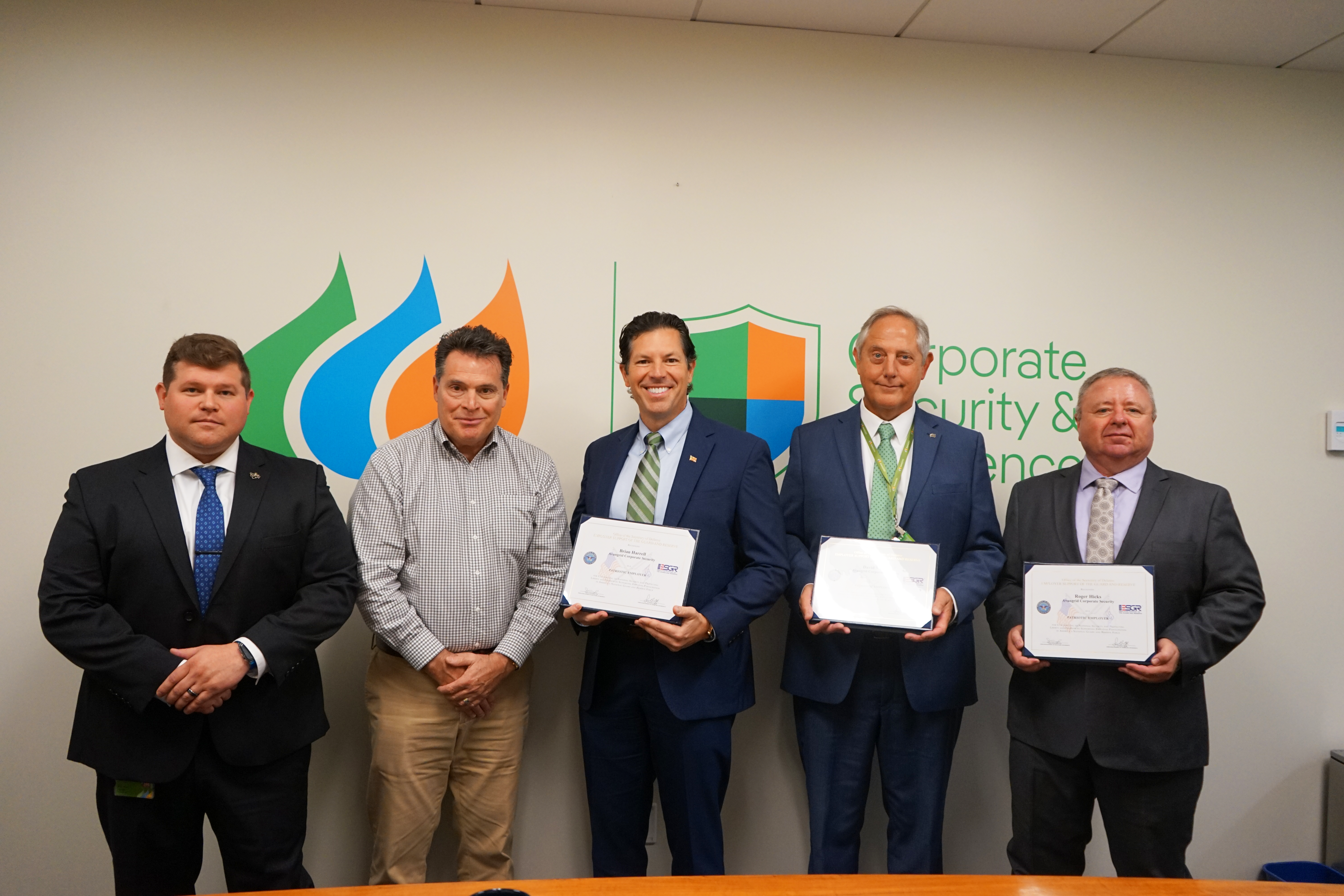 ORANGE, Conn. — September 4, 2024 — For the second consecutive year, Avangrid, Inc. (NYSE: AGR) team members have received the prestigious Patriot Award from the Department of Defense’s Employer Support of the Guard and Reserve (ESGR) department. The honor was presented to Avangrid’s Vice President and Chief Security Officer and U.S. Marine Corps veteran Brian Harrell, Director of Physical Security and U.S. Air Force veteran Roger Hicks and Senior Manager of Physical Security David McGill for going above and beyond to support uniformed team members who serve as a part of the National Guard and Reserve.